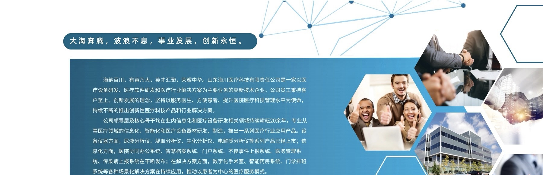 海纳百川,有容乃大,英才汇聚,荣耀中华。山东海川医疗科技有限责任公司是一家以医疗设备研发、医疗软件研发和医疗行业解决方案为主要业务的高新技术企业。公司员工秉持客户至上、创新发展的理念,坚持以服务医生、方便患者、提升医院医...